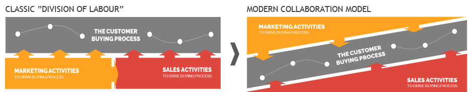 Historically, sales and marketing have operated as separate functions, with distinct separate responsibilities. Marketing was tasked with creating awareness and product catalogues. Sales was tasked with creating new opportunities and closing business. But in a digital world with endless connectedness these lines are increasingly blurred. Sales people are able to leverage digital tools to work as marketers, for example when they create a followership and establish themselves and the company they work for as defacto thought leaders within their field by utilizing social media to place messages with potentially hundreds or thousands of people in the blink of an eye. Marketing are able to leverage digital tools to work as sales people, for example when they leverage content marketing to place a highly relevant insight with a CXO in a must-win account based on very detailed knowledge about her interests and behaviour.